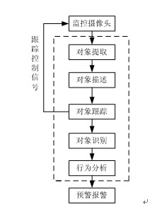 图1给出了智能视频监控系统的一般流程,从监控摄像机开始,包括运动对象提取、对象描述、对象跟踪、对象识别和对象的行为分析,最后进行预警或报警。