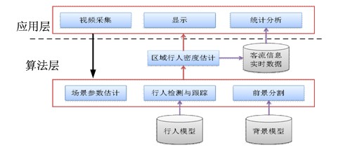 根据客流密度检测的功能需求,客流检测系统在结构上包括算法层和应用层。算法层分析输入视频,对区域内的行人密度进行估计,应用层根据算法层返回的数据进行统计和分析,并负责视频的采集和显示以及统计分析结果的展示。系统结构如图2所示。