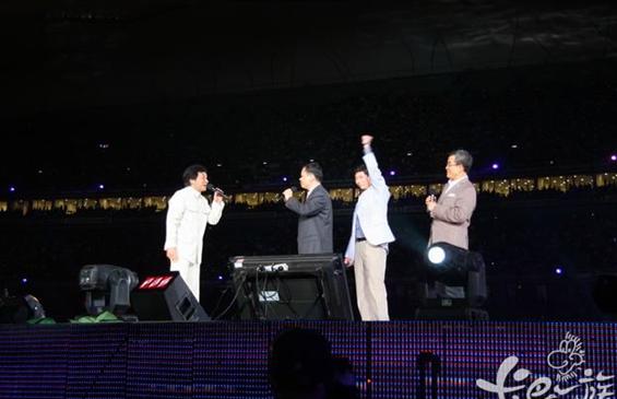 现场:本次演唱会,因为有成龙大哥,还有中港台韩超百人的各路明星“绿叶”而显得精彩纷呈,令到场观众目不暇接,大呼过瘾。舞台上流光溢彩、美轮美奂的灯光烟雾效果令人眼花缭乱,舞蹈演员舞在雾中,雾在舞中,宛若瑶池歌会;音响效果更是一绝,以鸟巢如此复杂的演出环境,即将成龙大哥低沉浑厚且亲切宜人的男低音近若耳畔,又将小沈阳狂飙中高音的厚重表达无遗,歌舞中又将混响表达的层次分明、高低有致、动感十足……