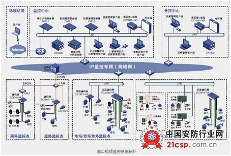 系统前端部分,针对不同区域的实际情况,可采用灵活的部署和接入方式。对于集装箱码头、保税仓库等货物集散地,根据摄像机部署的分散或集中情况采用相应的单路、多路编码器接入前端模拟摄像机,实现数字化的编码压缩和网络传输;重点的出入口部署全高清网络摄像机HIC 5421,摄像机对于60帧/ 秒工作模式的支持也使前端对于高速经过车辆等实现更清晰的采集,便于捕获快速移动物体的特征;港口内部的道路沿线,可采用EPON 接入方式,通过单芯光纤可实现多路监控点视频信息的传输,简化前端的部署,同时无源器件的采用也能大大提高系统的可靠性;对于港口周界监控点位的接入,除了采用EPON 接入外,还可使用RRPP 环网方式接入,通过将编码器和交换机组RRPP 环网,使系统具有对设备及链路及故障的自愈能力,在出现故障的情况下,系统可实现200ms 的故障收敛,保障视频数据的可靠回传和存储;对于大楼内部监控点位,可采用高密度的多路编码器,在保障图像质量的同时可有效降低系统的成本。报警和门禁系统也可通过开放的接口接入系统,实现高效的联动操作,提高系统的实战应用价值。