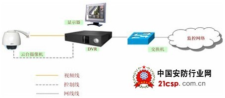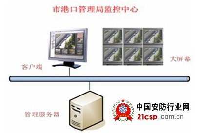 前端摄像机的视频、音频信号直接输入到DVR,实现在港口内部视频的实时浏览及本地存储,DVR完成模拟信号数字化后通过网络将视频信号传到市管理局视频监控中心,如下图所示: