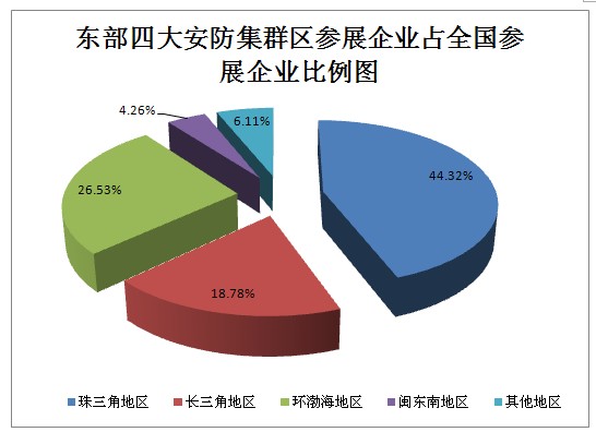 从东部四大安防集群区参展企业占全国参展企业比例图来看,珠三角地区参展企业占到45%,长三角地区接近20%,环渤海地区接近27%,闽东南地区占到4%,其他地区只占6%。这也充分印证了我国安防行业在东部地区呈现的四大安防产业集群逐步明朗。