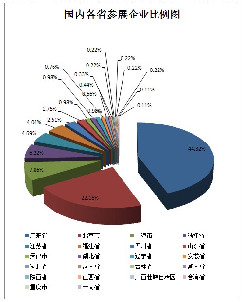从国内各省2012年安博会参展企业比例图分析来看,前四位省(市)依次为广东省占44.3%,北京市占22.2%,上海市占8%,浙江省占6.2%,同时这几个省(市)又是我国安防三大产业集群的核心,再一次说明了安防产业的高度集中。