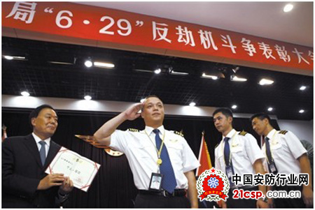 7月6号,民航局局长李家祥为机组人员颁奖,机长邹劲松在领奖前敬礼