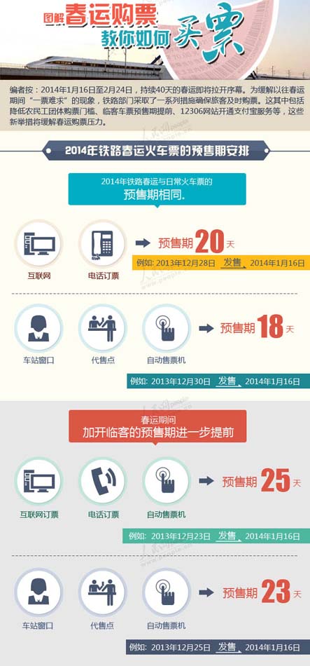 2014年铁路春运将从1月16号开始,2月24号结束。2014年1月16日春运第一天的火车票将于12月28日发售,即图定旅客列车互联网和电话订票的预售期为20天。 至此,大批量春运火车票将于12月28日开售。