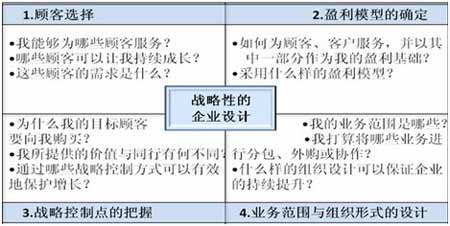 针对这种现象,我国著名学者华南理工大学工商管理学院陈春花教授曾告诫:"中国有部分中小企业存在着生存问题是因为他们的思维方式不是战略性思维模式。所谓战略的思维模式是:做什么、不做什么和企业自己要做什么,这要很清晰。"因此,她提醒经营者们不能忽视"战略性的企业设计"(如下图)。这同样值得我们大屏幕拼接企业去思考,比如,如何针对DLP和LCD两大市场进行战略性的设计。