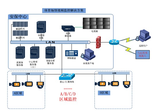 体育场馆安防建设主要包括视频监控、出入口门禁控制、周界入侵报警、电子放哨及车辆管理等五个部分。