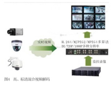 高清视频解码器主要功能是从网络上获取视音频数据流,将数字信号转换还原为模拟信号,输出到监视器、接拼大屏等监控显示设备(如图4所示)。作为高清视频监控的后端解码设备,其应该具备以下基本特性: