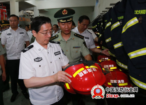 图为郭声琨来到沈阳启工消防中队,仔细查看该中队装备。