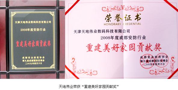 由第九届成都国际安博会组委会、成都安全防范协会共同举办的2008年度成都安防行业《重建美好家园贡献奖》于2009年4月22日揭晓,在全国众多安防厂商中评选出6家贡献突出的单位,天津天地伟业数码科技有限公司凭借在5.12汶川地震灾后重建中的突出贡献获此殊荣。