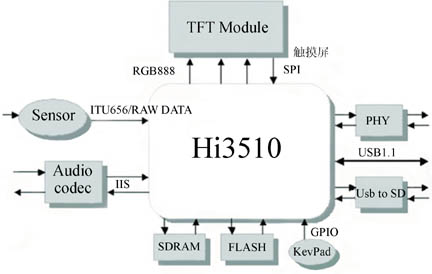 以hi3510为核心,配备图像传感器作为影像输入源,视频信号通过itu656接口输送给hi3510,hi3510对数字视频进行压缩处理,经过phy将数据以tcp/ip包传输到目的地;同时,hi3510对通过phy传送的tcp/ip包进行解码、缩放,通过rgb888接口送至tft module显示;为方便用户进行选择操作,可通过spi接口及gpio实现触摸屏和按键功能;语音数据则通过一颗音频codec进行ad编码后通过i2s总线送往hi3510处理。