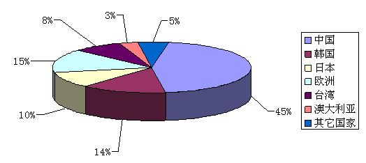 目前楼宇对讲产业较发达的国家和地区主要有意大利、西班牙、日本、韩国、德国、中国大陆、中国台湾等,如果按产量算,中国的份额最大,约占45%,韩国14%,日本10%,欧洲15%,台湾8%,澳大利亚3%,其他国家和地区5%。
