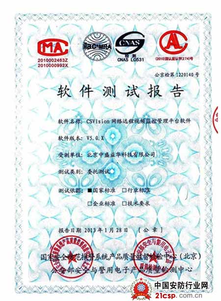 近日,中盛益华CSVision网络远程视频监控管理平台软件通过了国家权威检测机构的委托测试,由"国家安全防范报警系统产品质量监督检验中心(北京)"和"公安部安全与警用电子产品质量检测中心"出具的检验报告中指出,CSVision网络远程视频监控管理平台软件的检测结果符合GB/T28181-2011《安全防范视频监控联网系统信息传输、交换、控制技术要求》。