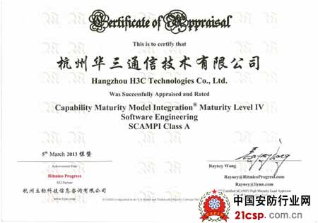 2013年3月5日,在经历了9天对10个开发项目和各个角色小组近80人次的证据评估和访谈后,来自新加坡的CMMI高成熟度主任评估师RayneyWong正式宣布:杭州华三通信技术有限公司Comware平台开发符合CMMI4级所有要求,正式通过CMMI4级认证评估。H3C也因此成为通信领域中仅有的几家拥有有效CMMI4证书的企业之一。