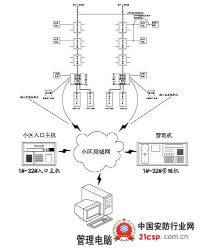 以上设备联网总线基于小区局域网,采用TCP/IP协议。其余联线均采用1根5类线加1根RVV2*0.5电源线的“1+1”方式(入户线距小于20米时可省去入户电源线),将小区联成一个功能完善的音视频、报警及信息通讯网络。