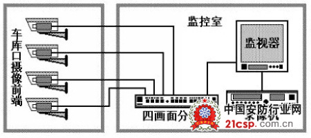 对车库进出口、单元楼入口处的监视,建议采用固定监视点,使用定焦定向的摄像系统,每一个点设置一台摄像机,进行全天候监视,在后端监控室(保安中心)将每一个摄像点通过画面分割器进行画面组合,并将组合画面送至监视器和专业长延时录像机进行24小时录像,录像带可留档备查。如下图所示一个车库摄像组的结构: