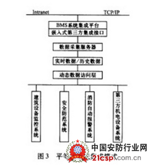 基于子系统平等方式的系统集成模式,通过开发与BA、FA、SA以及其他第三方系统的网络通信接口,将各种系统集成到一个平台上来。集成模型的设计基于组件和标准开放式平台,各个子系统的接口模块以组件形式加入。集成平台通过接口模块与子系统进行通信和控制,根据收集各个子系统的信息来进行显示和判断。