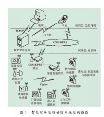 通常物联网应用系统可以分为三层:感知层、网络层和应用层。感知层主要是识别物体,采集信息;网络层主要是信息传递和处理,实现通信与互联网的网络融合;应用层则是物联网与行业专业技术的深度融合,其与行业需求结合,实现行业智能化。下面以一个基于物联网技术的智能家居远程安防系统为例来介绍其系统结构,其系统结构框图如图1所示。